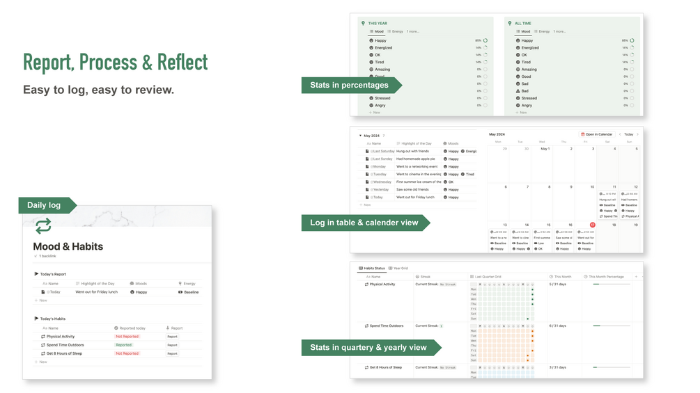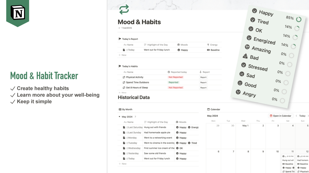 This product is for anyone wanting to track their mood and create healthy, positive habits. Staying on track can be difficult, and most of us have little insight into how we actually feel over time. This template exists to help solve this problem. -