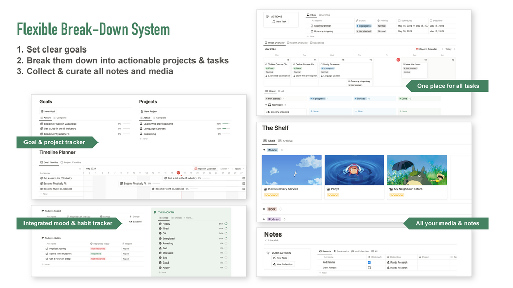 I created this template to provide an intuitive yet comprehensive way to plan my time and better understand what is important to me while still keeping the structure flexible and not overwhelming. This template provides a comprehensive set of tools for breaking down your goals, projects, tasks and habits, but it also gives you the choice of how much of this structure you actually want to use. Plan out all the details or just start assigning tasks into the calendar, or both. You are in charge!